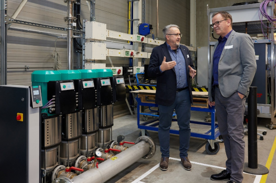 (Daniel Huber(Huber首席执行官)向地区行政长官 Frank Scherer 展示经过优化的泵系统,该系统提高了热回收的效率。)